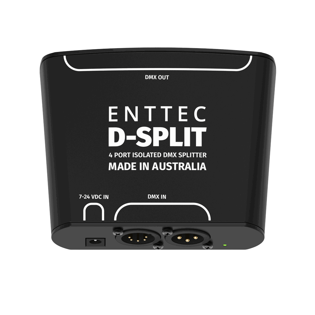 With its stylish black ABS body, designed and made in Australia, the D-Split DMX opto-splitter will make life easier with simplified DMX distribution. The D-Split is both an optical splitter/isolator and repeater for DMX512.