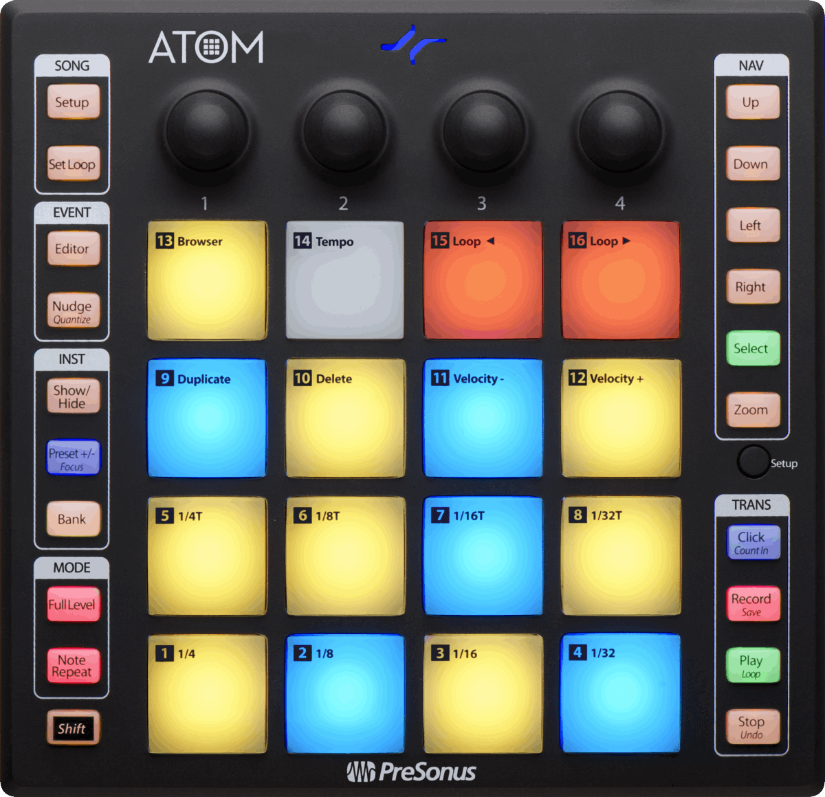 Capture the beat whenever and wherever creativity strikes with PreSonus®' ATOM. An intuitive, musical, MIDI pad controller, ATOM's dynamic, ultra-sensitive pads will give you all the expression you need, whether you're making a beat, creating a driving synth line, or triggering sound effects and loops on the fly. Tight integration with both Studio One® and Ableton® Live mean that you stay inspired without missing a beat. Your focus will be off the screen and on your performance - where it matters most.