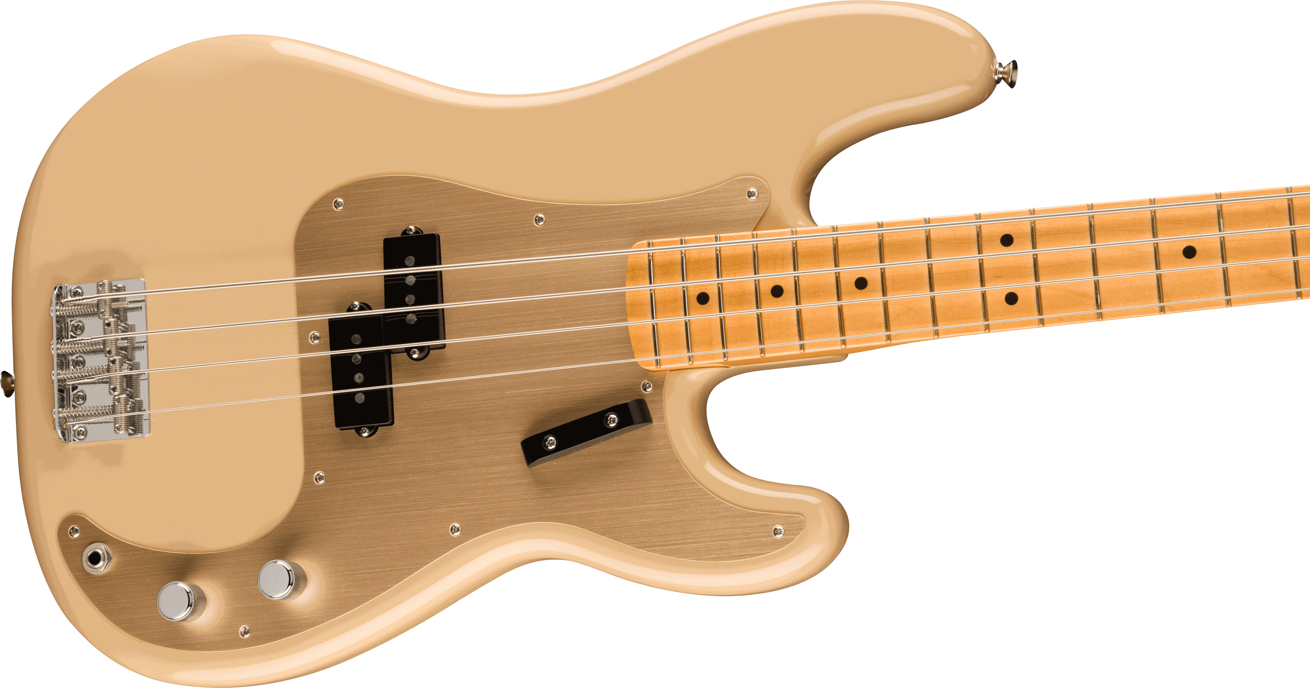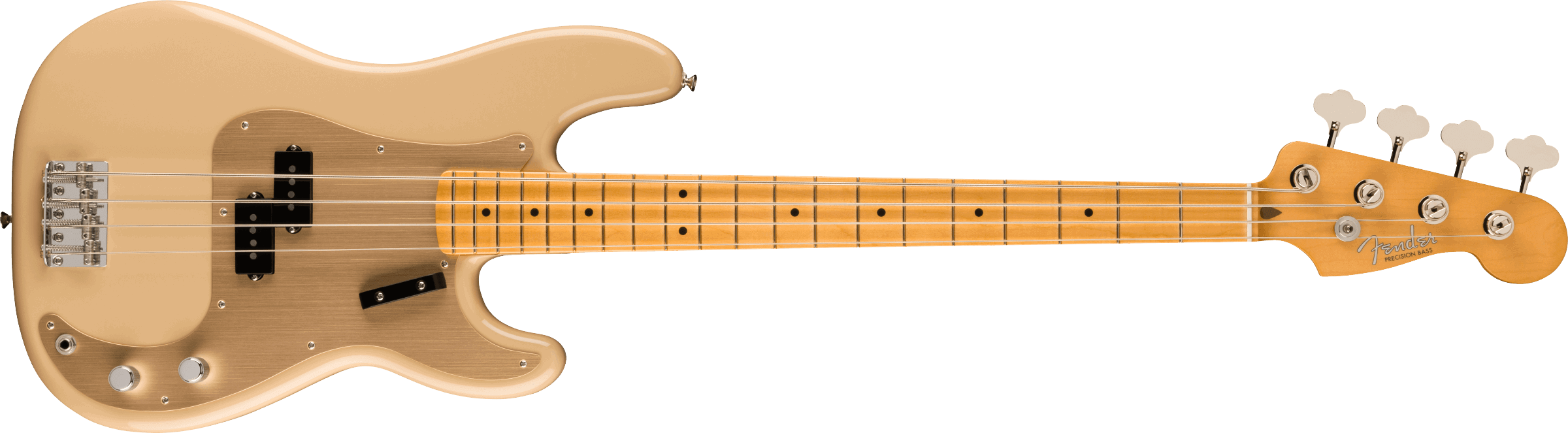 Vintera® II '50s Precision Bass® har en or-kropp og en lønnehals for en klassisk fendertone som er full av trøkk og klarhet. Den "C"-formede halsen på slutten av 50-tallet gir et komfortabelt kjent grep som føles akkurat i hånden din, mens gripebrettet med en radius på 7,25 tommer med vintage-høye bånd gir vintage komfort med god plass til store bøyninger og uttrykksfull vibrato. panseret, den delte spolen i vintage-stil fra 50-tallet leverer den ikoniske Fender-lyden: varm, treaktig, dynamisk og kraftig. Vintage-stil 4-salbroen og vintage-stil tuning maskiner gir klassisk utseende med forbedret intonasjon og tuning stabilitet for å fullføre pakken.