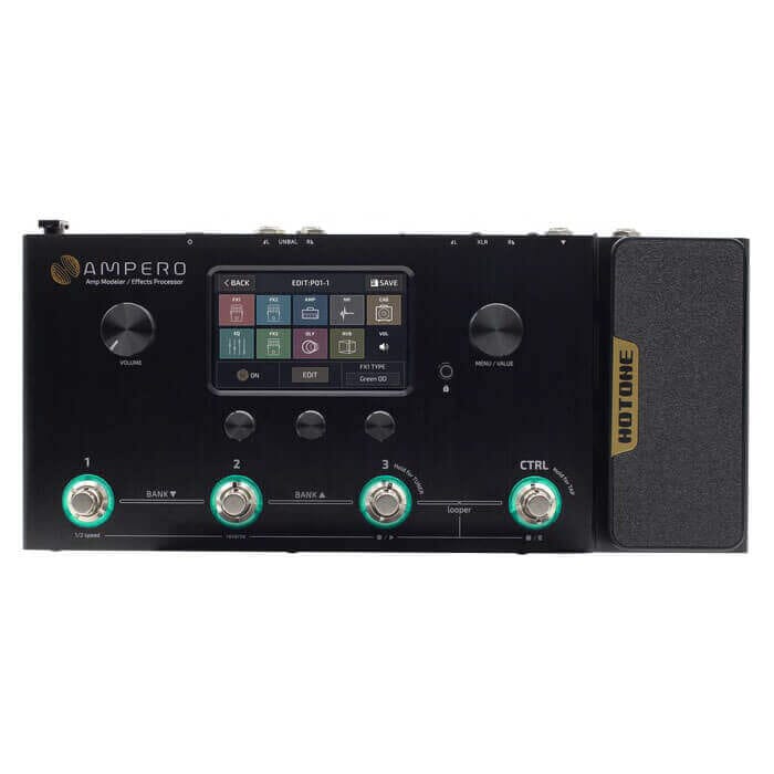 Hotone Ampero er en forsterker- og effektmodellerer som overbeviser med sitt kompakte format og lettanvendelige brukerflate, som bl.a. er basert på en 4"" touchskjerm. Hotone Ampero benytter seg av en kraftfull SHARC-Dual-prosessor, samt teknologiene Comprehensive Dynamic Circuit Modelling High Definition (CDCM HD) og Field Impulse Response Enhancement (F.I.R.E.) for å produsere autentiske forsterkeremuleringer og levende og organiske effekter i høy kvalitet. Dessuten er Hotone Ampero utrustet med en avansert looper og trommemaskin, slik at Ampero kan fungere som en omfattende gulvenhet til alle dine behov. I tillegg til ubalanserte og balanserte stereoutganger, har Hotone Ampero også en USB-port til det integrerte lydkortet eller til firmware-oppdateringer, og en MIDI-inngang. En ekspresjonspedal, aux-inngang og hodetelefonutgang fullender Hotone Ampero.