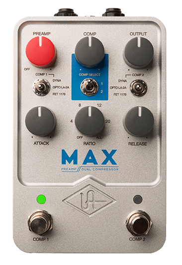 Max Preamp & Dual Compressor er bygget på prisvinnende UAFX dual-motor prosessering og et brennende ønske om det ultimate innen sonisk legitimitet, og setter den fargerike lyden av tre legendariske limitere og en ikonisk rørforforsterker for dine føtter.