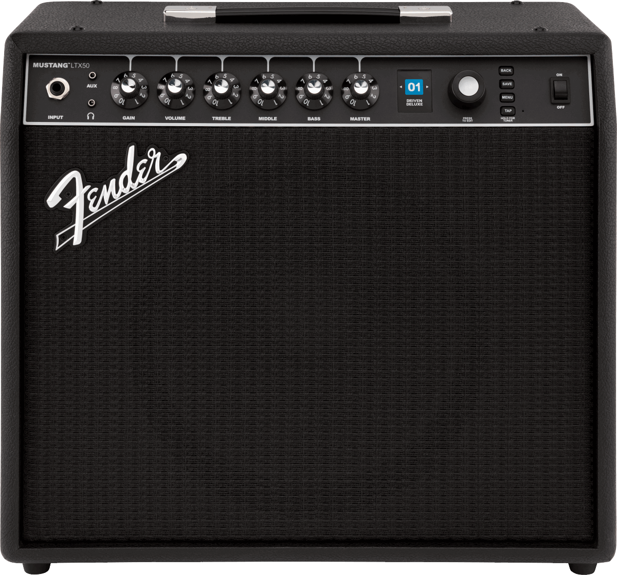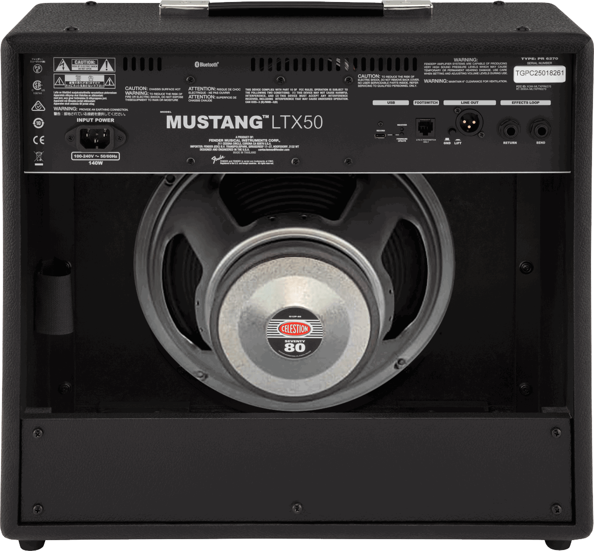 Mustang® LTX 50 is ideal for practice or performance with a 12" Celestion® G12P-80 speaker and an optional gig-ready 5-button footswitch. Onboard Bluetooth® allows you to jam along with your favorite songs as well as create, edit, download and share presets using the Fender TONE® app.